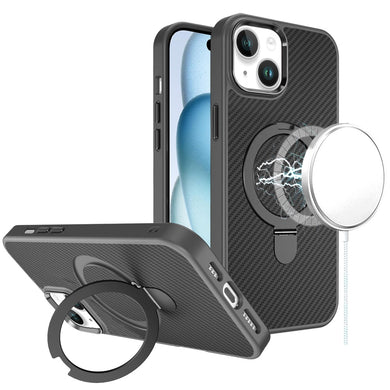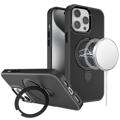 For iPhone 15 Pro Max Case Carbon Fiber Print RingStand Circle +2 Tempered Glass