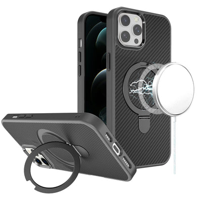 For iPhone 12 Pro Max Case Carbon Fiber Print Ring Stand Circle + Tempered Glass